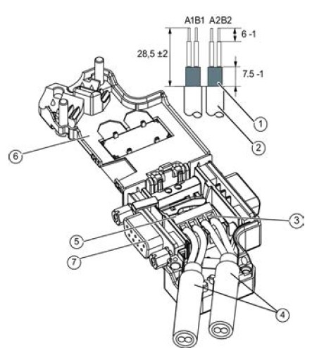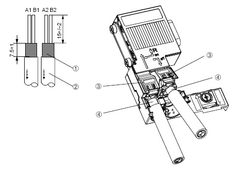 Bus connection for all other nodes on the PROFIBUS. The feed cable should always be connected on the left (A1, B1). The continuation cable should always be connected on the right (A2, B2).