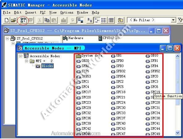 4, On-line test can access the points: USB / MPI + connect the MPI port of the S7-300/400PLC with the computer’s USB port. Click on the main menu interface, as shown in a red circle button. If the data in red box is shown as the picture, the on-line test has pasted. As so far, the setting has completely finished. It can do all Operation such as upload, download ,monitoring of the procedures and other operations.