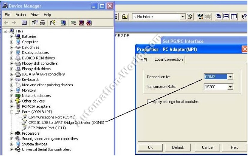 2, Click on “Local Connection” option to set the parameters of COM port, correct choose the COM port in the equipment manager after the driver of USB / MPI + USB has been installed, select the 19200 bps or 38400 bps as the baud rate of COM Communication. USB / MPI + will automatically adapt to the choice of baud rate.